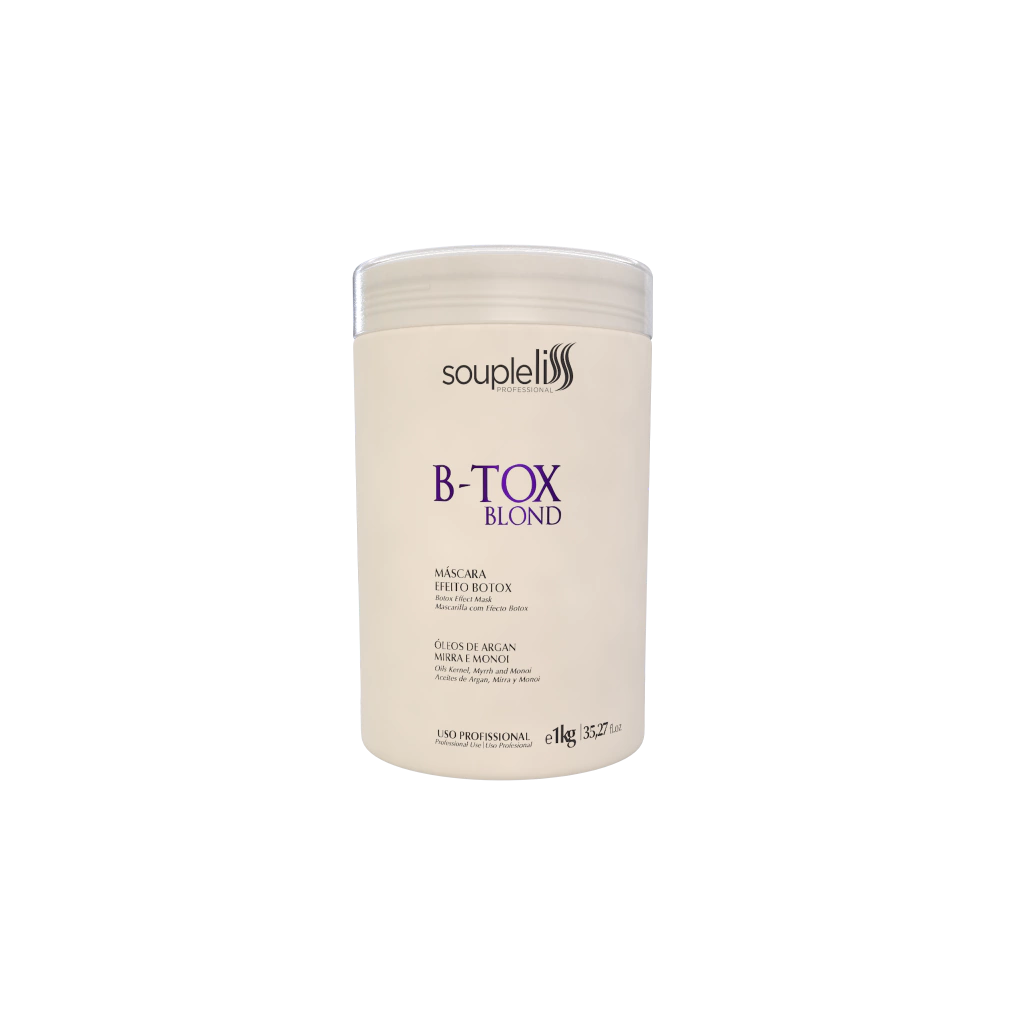 Blond liss B-tox Mascarilla Matizante Souple Liss es un repositor de masa molecular que actúa sobre el córtex de la fibra capilar, apto para todo tipo de cabello, cuenta con una eficaz fórmula innovadora con Keratina y silicona, formando una película protectora que envuelve la raíz hilos hasta las puntas restaurando la flexibilidad natural del cabello y dando hidratación y resistencia a los hilos.